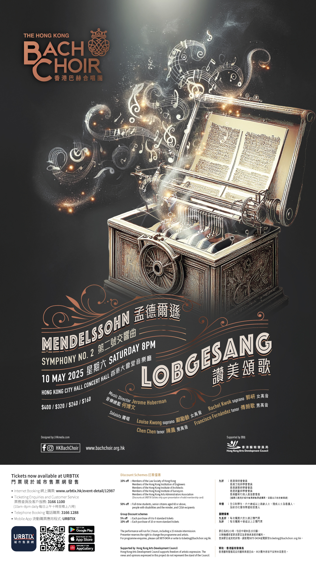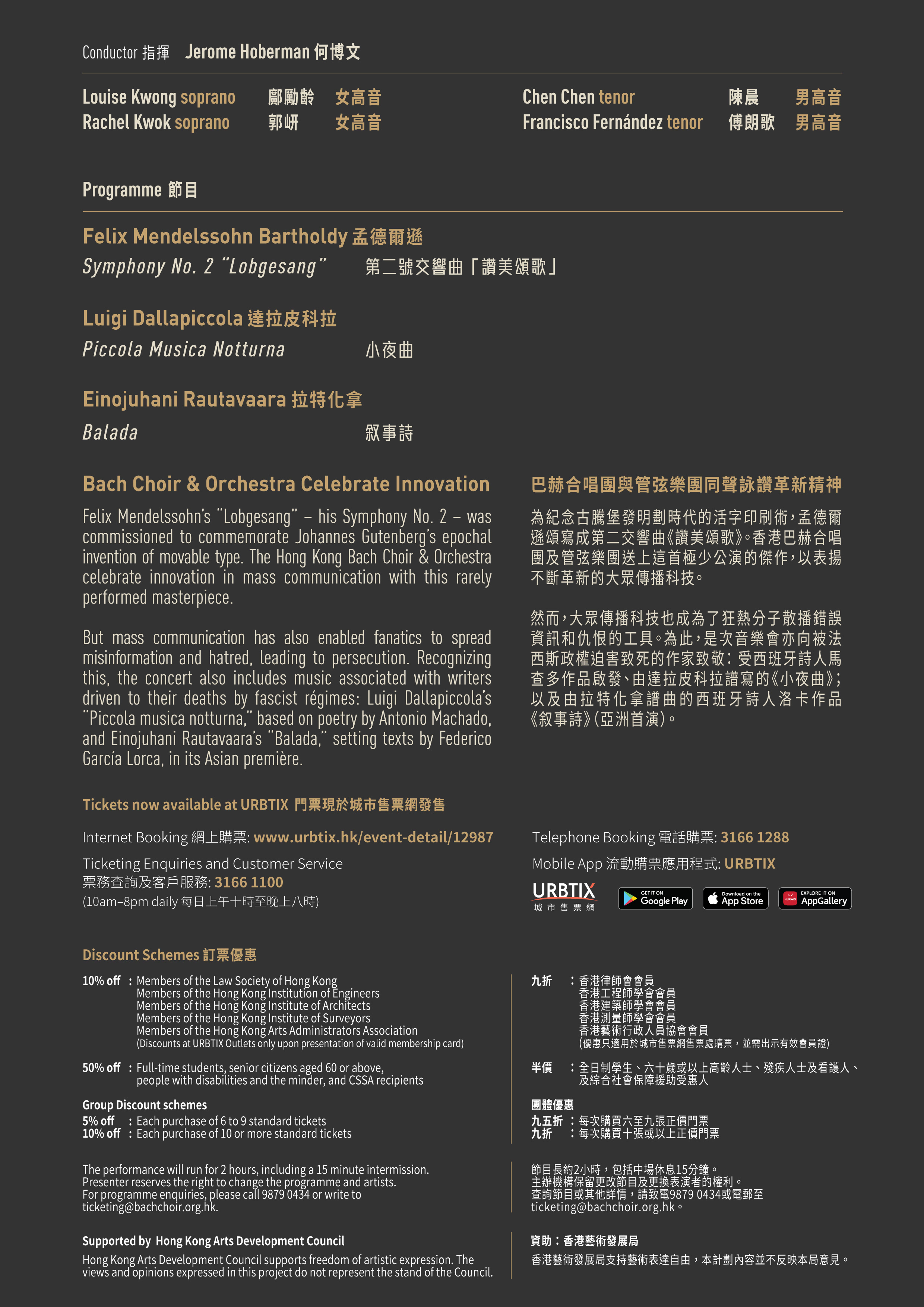 Featured soloists are sopranos Louise Kwong and Rachel Kwok, and tenor Chen Chen. Jerome Hoberman conducts.