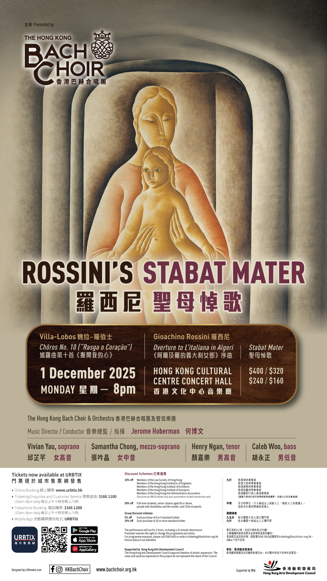 大家對羅西尼的誤解似乎太多了,為了還他清白,香港巴赫合唱團及樂團將於12月1日(星期一)晚上,在尖沙咀海濱的香港文化中心音樂廳上演羅西尼的傑作《聖母悼歌》。