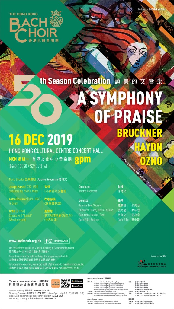 A Symphony of Praise sets in illuminating opposition two superb but rarely performed works from 18th- and 19th-century Austria by two of music’s greatest masters, and a new work by one of Hong Kong’s most respected musicians and composers. The programme is in fact a symphony in three movements — from the dark tempestuousness of Haydn Symphony No. 95 in C minor, to OZNO Cantata Nr. 3 “Gabriel”, to the brilliant jubilation of C major in Bruckner Te Deum.